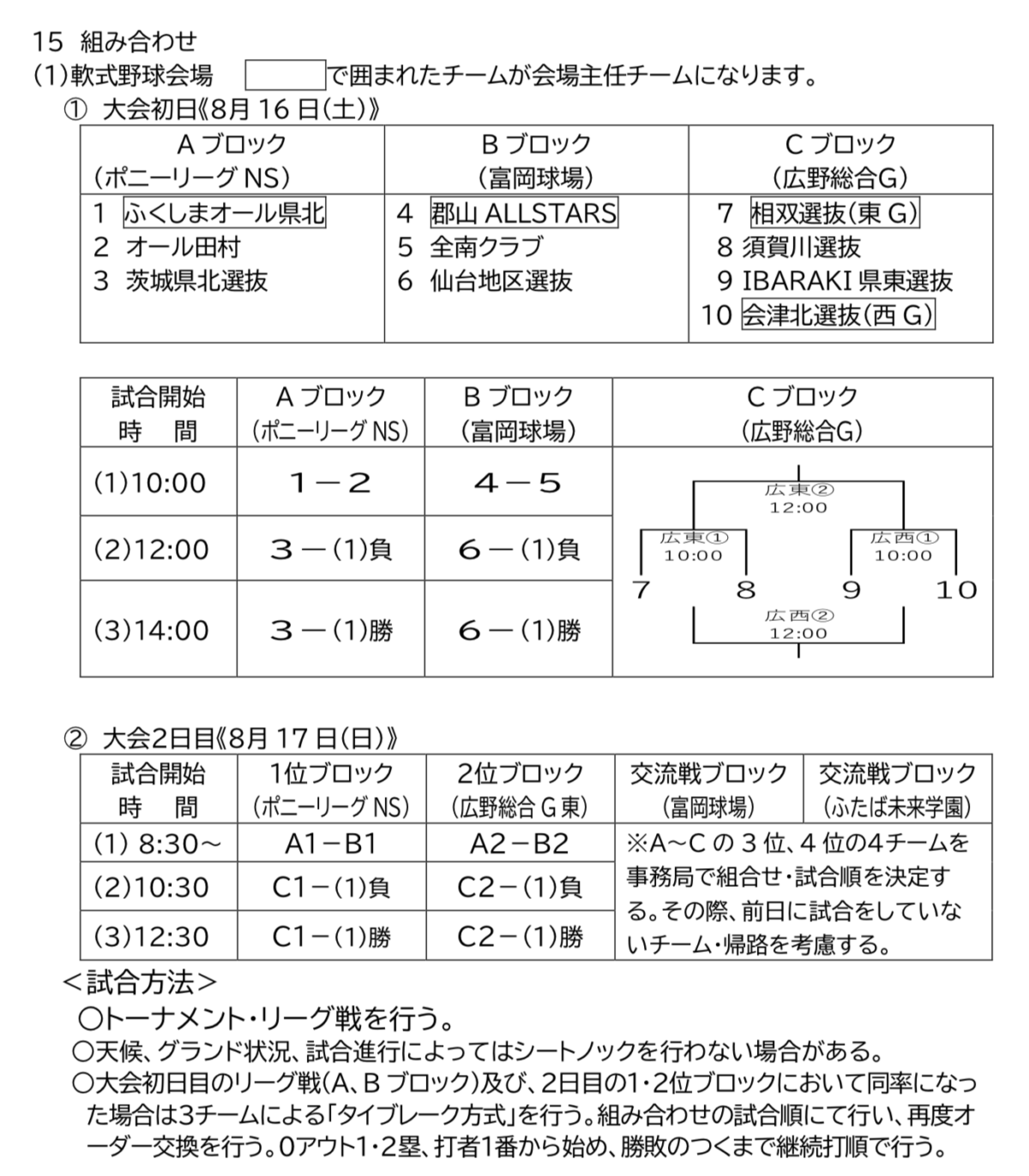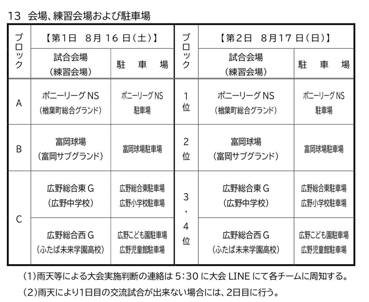 (6)各会場ともに左側(番号の若いチーム)が1塁側ベンチとする。